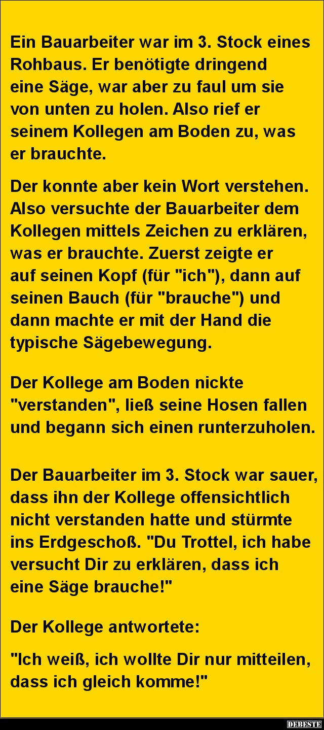 Der Bauarbeiter im 3. Stock war sauer, dass ihn der Kollege offensichtlich nicht verstanden hatte und stürmte ins Erdgeschoß. "Du Trottel, ich habe versucht Dir zu erklären, dass ich eine Säge brauche!"