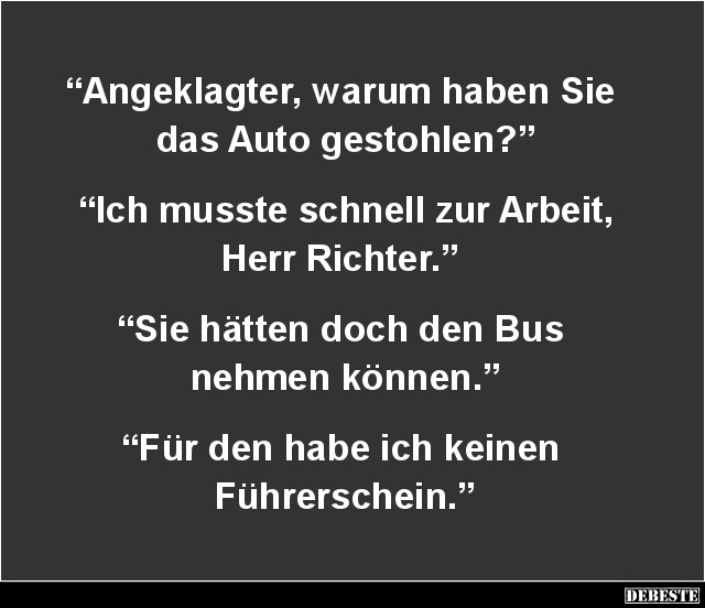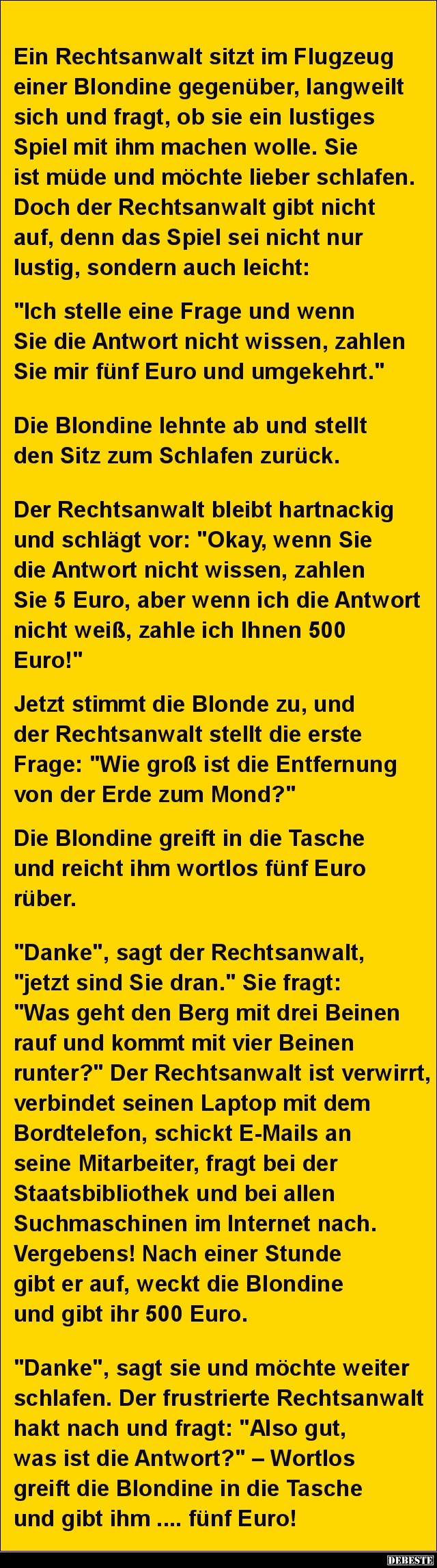 "Danke", sagt sie und möchte weiter schlafen. Der frustrierte Rechtsanwalt hakt nach und fragt: "Also gut, was ist die Antwort?" – Wortlos greift die Blondine in die Tasche und gibt ihm .... fünf Euro!