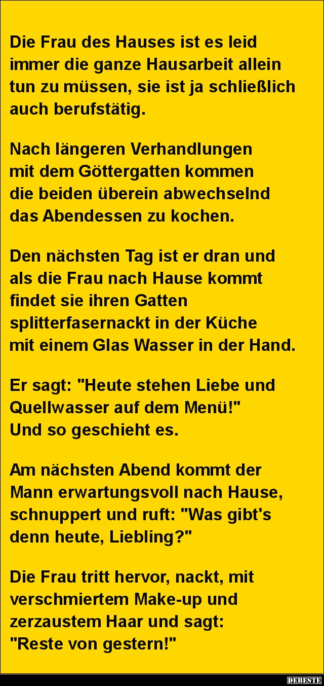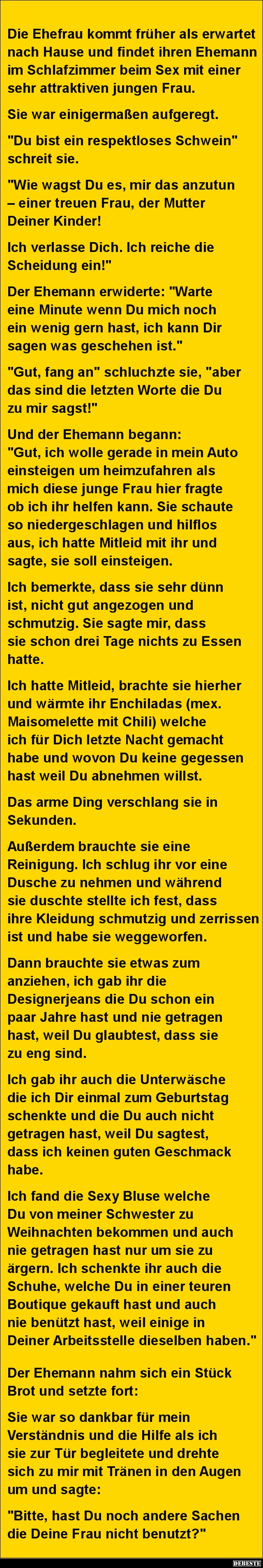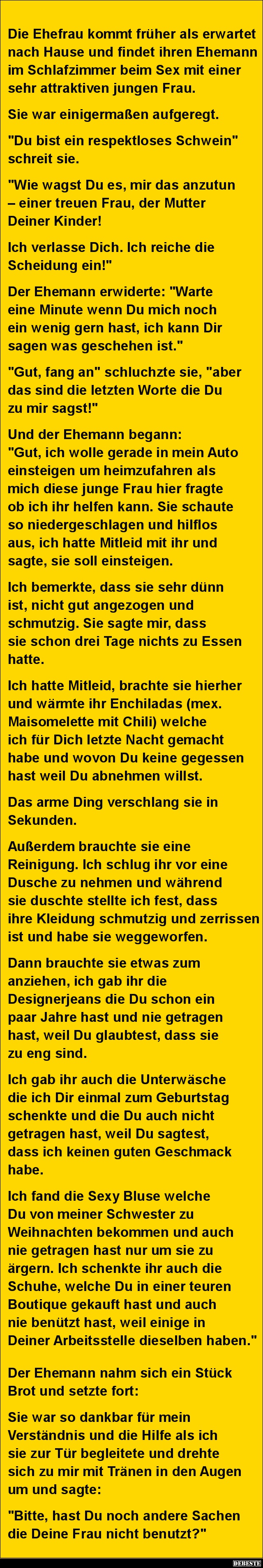 Der Ehemann erwiderte: "Warte eine Minute wenn Du mich noch ein wenig gern hast, ich kann Dir sagen was geschehen ist."