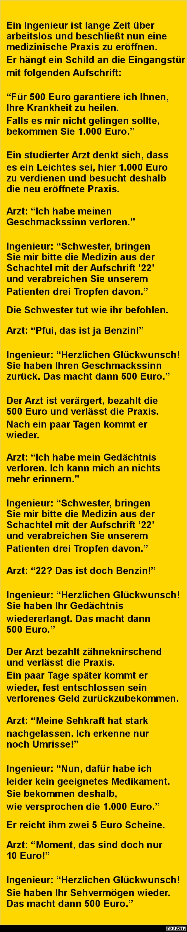 Ingenieur: “Herzlichen Glückwunsch! Sie haben Ihren Geschmackssinn zurück. Das macht dann 500 Euro.”