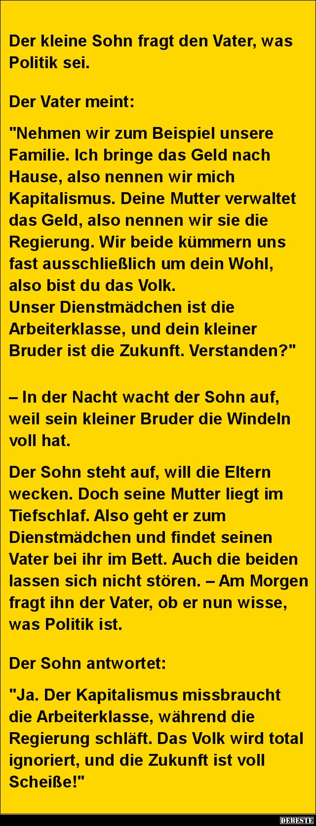Der kleine Sohn fragt den Vater, was Politik sei.