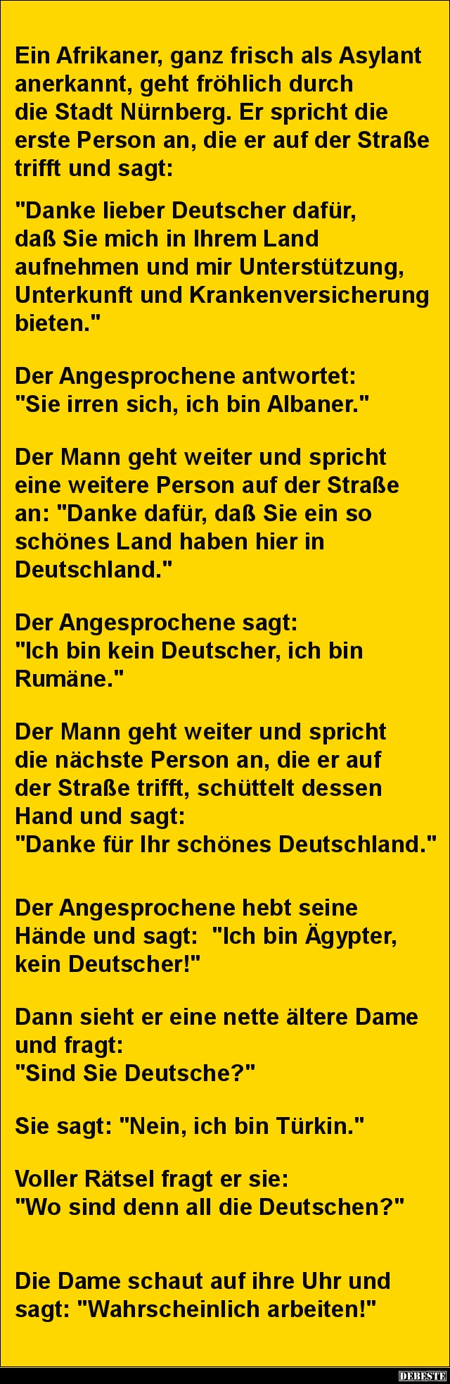 Ein Afrikaner, ganz frisch als Asylant anerkannt, geht fröhlich durch die Stadt Nürnberg. Er spricht die erste Person an, die er auf der Straße trifft und sagt: