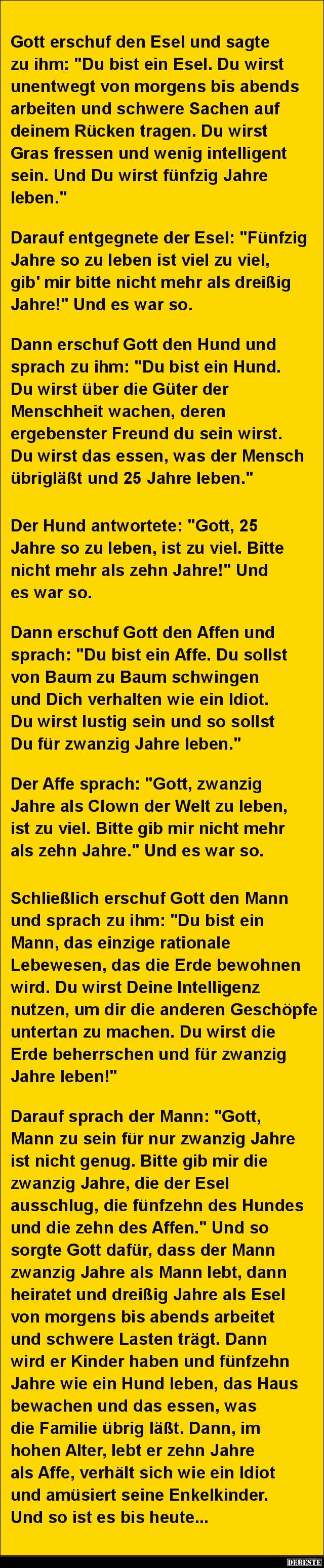 Gott erschuf den Esel und sagte zu ihm: "Du bist ein Esel. Du wirst unentwegt von morgens bis abends arbeiten und schwere Sachen auf deinem Rücken tragen. Du wirst Gras fressen und wenig intelligent sein. Und Du wirst fünfzig Jahre leben."