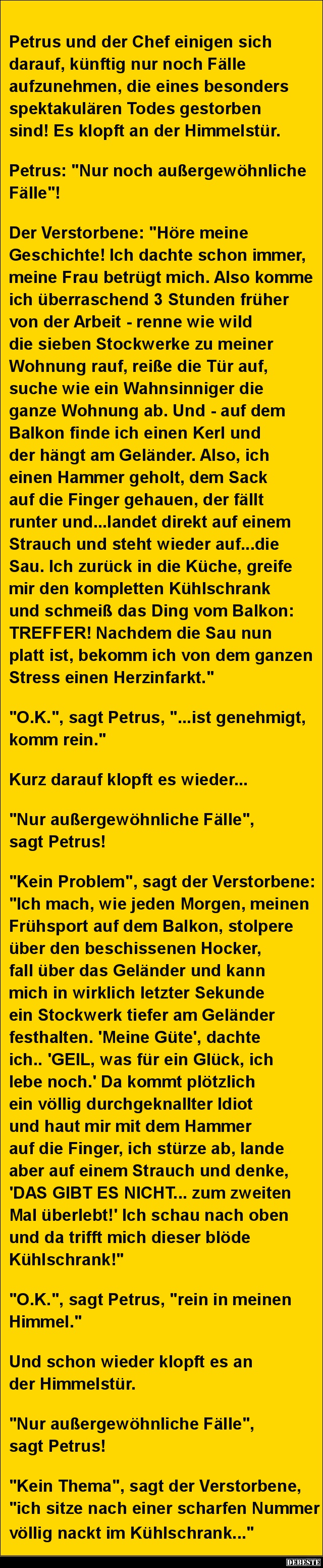 "Kein Problem", sagt der Verstorbene: "Ich mach, wie jeden Morgen, meinen Frühsport auf dem Balkon, stolpere über den beschissenen Hocker, fall über das Geländer und kann mich in wirklich letzter Sekunde ein Stockwerk tiefer am Geländer festhalten. 'Meine Güte', dachte ich.. 'GEIL, was für ein Glück, ich lebe noch.' Da kommt plötzlich ein völlig durchgeknallter Idiot und haut mir mit dem Hammer auf die Finger, ich stürze ab, lande aber auf einem Strauch und denke, 'DAS GIBT ES NICHT... zum zweiten Mal überlebt!' Ich schau nach oben und da trifft mich dieser blöde