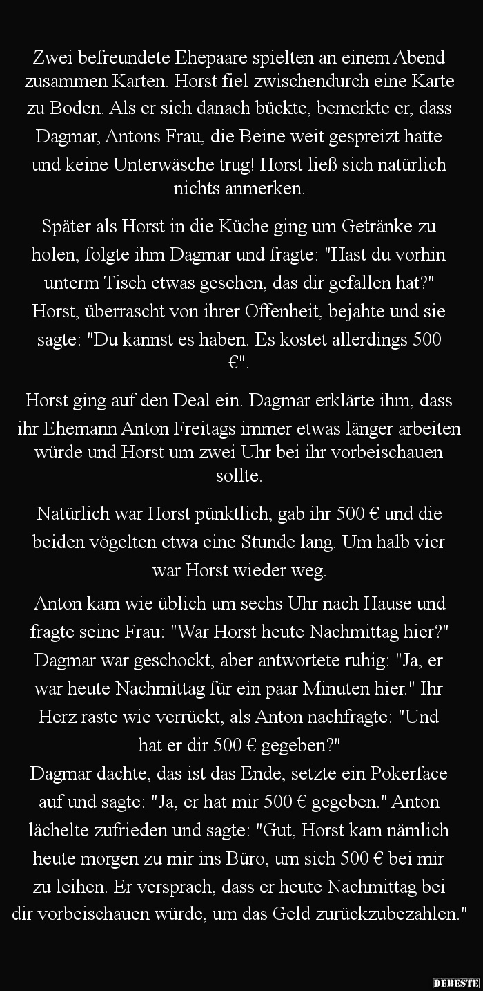 Dagmar dachte, das ist das Ende, setzte ein Pokerface auf und sagte: "Ja, er hat mir 500 € gegeben." Anton lächelte zufrieden und sagte: "Gut, Horst kam nämlich heute morgen zu mir ins Büro, um sich 500 € bei mir zu leihen. Er versprach, dass er heute Nachmittag bei dir vorbeischauen würde, um das Geld zurückzubezahlen."