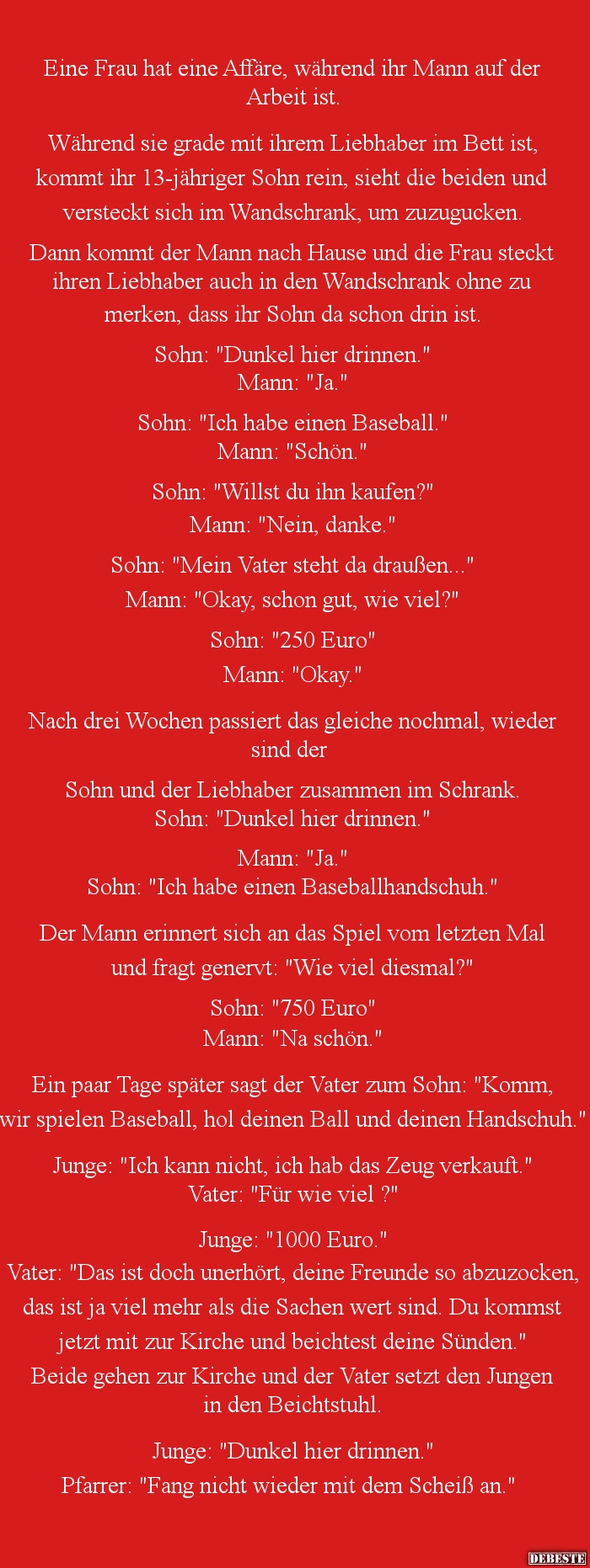 Vater: "Das ist doch unerhört, deine Freunde so abzuzocken, das ist ja viel mehr als die Sachen wert sind. Du kommst jetzt mit zur Kirche und beichtest deine Sünden."